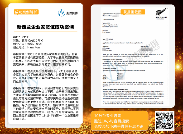 恭喜X女士成功獲批新西蘭企業家簽證!可以準備登陸新西蘭,開啟...