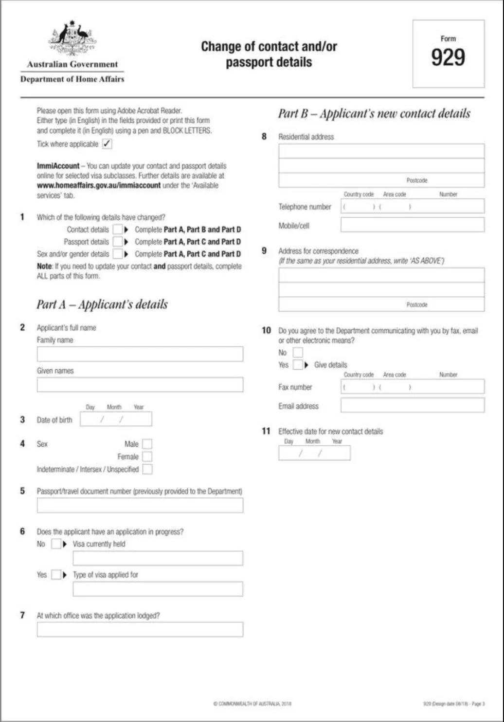 2.填寫地址和/或護照信息變更929表格,電子郵件到929@homeaffairs.gov.au這是自2018年3月1日起,澳大利亞內政事務部為申請人提供郵件更新護照信息服務。我們選擇第二種方式