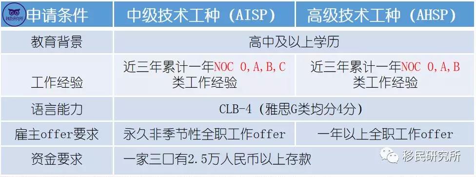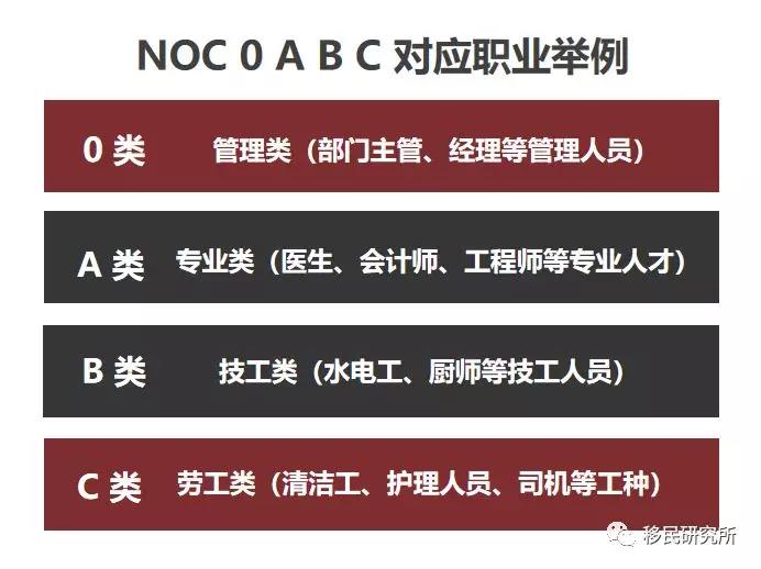 如上圖,學歷要求高中,受認可的中專學歷也是可以的,CLB-4也并不難,相當于雅思聽力4.5分,閱讀3.5分,寫作4分,口語4分的初級英語水平,工作經驗要求過去三年里面累計一年即可,全職、兼職或者是不連續的工作都可以,累計一年即可,當然,這些工作需要是在加拿大加拿大國家職業分類(NOC)里屬于0,A,B,C四類的
