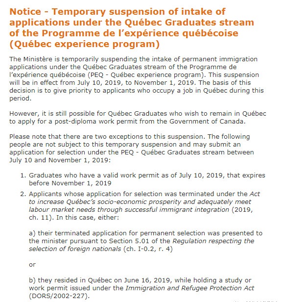 根據官方消息,從2019年7月10日至2019年11月1日。魁北克移民局將暫停接收魁北克PEQ項目-留學生轉移民申請人的CSQ申請。在此期間所有魁北克學習項目畢業生仍然可以向加拿大移民部申請畢業后工簽(Post-graduate work permit),以獲得繼續在加拿大合法工作和居留的身份。