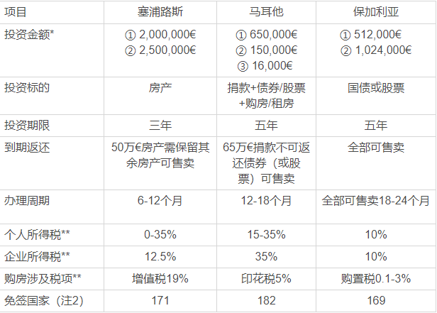 從上表中可以發現,馬耳他的投資方式是最多的,投資金額方面,保加利亞相對較低,塞浦路斯在投資期限和辦理周期方面有優勢。對于需要避稅的朋友,建議選擇保加利亞,個人所得說和企業所得稅僅為10%。免簽國方面,持有這三個國家的護照出行都較為便利,馬耳他的免簽國家相對來說更多一點。大家可根據自己辦理護照的需求和初衷去選擇對應的國家和項目。