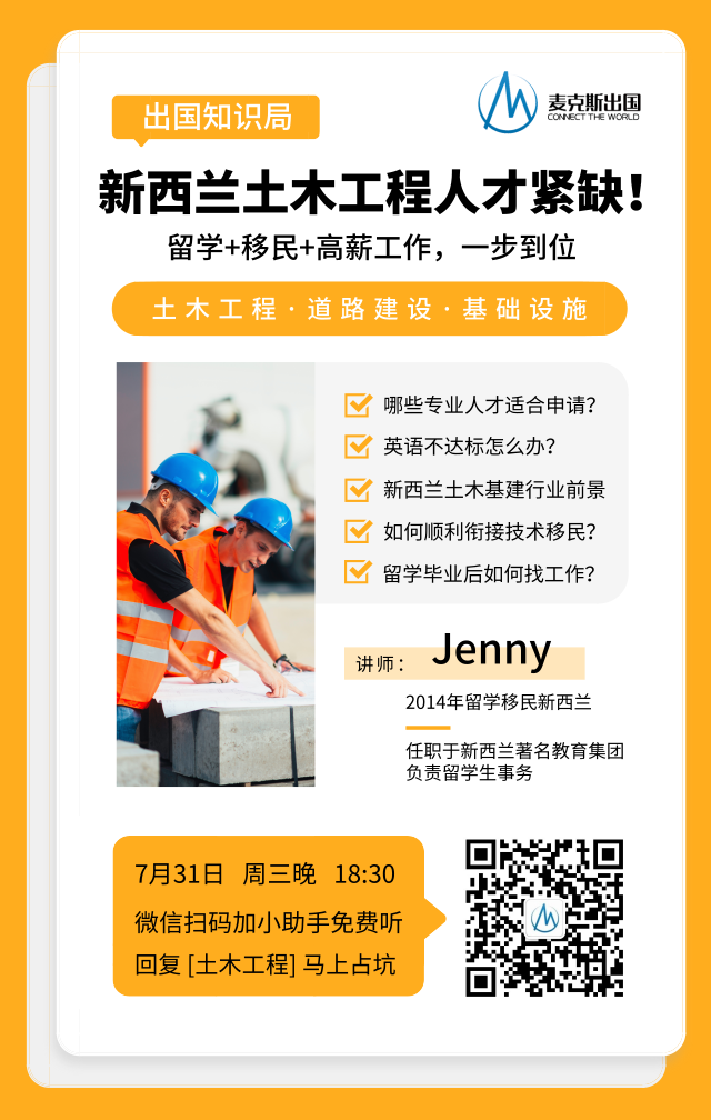國內就業前景不好,土木工程專業怎么拿高薪?土木工程相關行業,怎么技術移民新西蘭?新西蘭土木工程畢業生,可以從事哪些工作?無工作經驗的土木畢業生,留學新西蘭靠譜嗎?麥克斯出國小編為您帶來了解決方案,麥克斯出國知識局系列講座——《土木工程專業移民新西蘭,如何找高薪工作》,為您解決土木工程專業留學新西蘭,畢業后的工作和移民等問題!