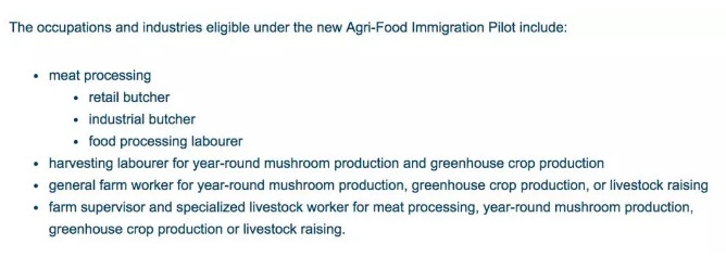 這個移民計劃將為加拿大的農業食品行業(尤其是蘑菇種植以及肉類加工)對普通勞工的大量需求提供解決方案。雖然農業領域需要的主要是季節工,但希望通過該試點移民項目取得永久居民身份的人則必須是非季節性且有工作經驗的工人,主要包括:屠夫、食品加工工人、農業采摘工、農場普通工人、農場監工、以及畜牧養殖工人,等等。農業工人主要指的是蘑菇種植農場以及溫室蔬菜農場的全職工人。