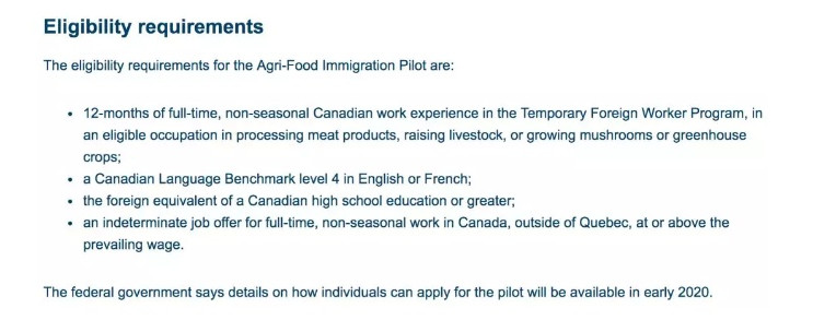 (1)通過臨時外國勞工項目獲得不低于12個月的全職非季節性加拿大工作經驗,主要職業包括肉類加工、畜牧養殖、蘑菇種植、溫室種植等等。