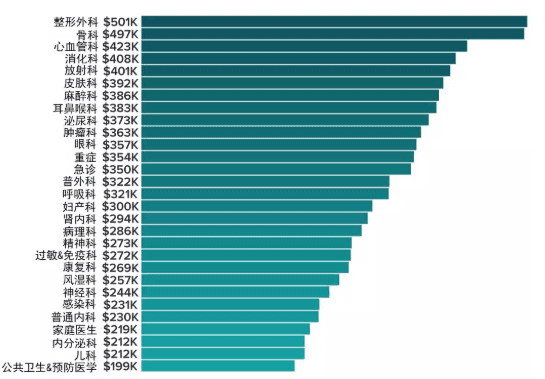 醫生行業的薪資水平高在美國早已不是什么新聞。初級保健醫生(PCP)的平均收入數字就已經是驚人,為195,000美元,約合人民幣1,344,856,而專科醫生的平均收入更是高達令人瞠目的284,000美元! 如果您在醫學方面頗有建樹,移民之后選擇成為一名醫生,工資的漲幅可謂飛漲,拿骨科進行對比,美國骨科科室的平均年收入高達497K美元,而中國的骨科科室的平均年收入僅為66,823人民幣。