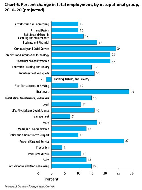美國勞工部預計2010年到2020年的就業崗位變化如下圖: