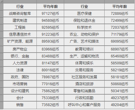 上表為2018年新西蘭各行業(yè)的平均年薪,目前IT信息、建筑制造、工程、信息通信技術(shù)、礦產(chǎn)資源能源、房產(chǎn)物業(yè)、銀行金融、人力資源、法律排名最前,薪資最高。