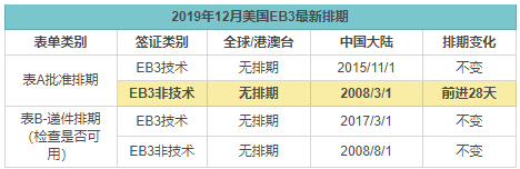 按照12月最新的排期表,EB3非技術(shù)移民目前的中國(guó)大陸優(yōu)先日為2008年3月,按照這個(gè)趨勢(shì),目前申請(qǐng)EB3的話將面臨10年排期。