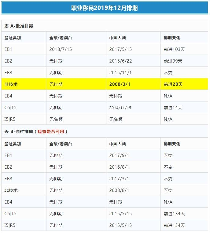 而EB3移民由于門檻低,每年申請人很多,尤其是中國大陸,申請人更是遠遠超過配額,所以大陸人申請EB3 移民排期較長。按照美國移民局最新公布的2019年12月職業移民排期如下: