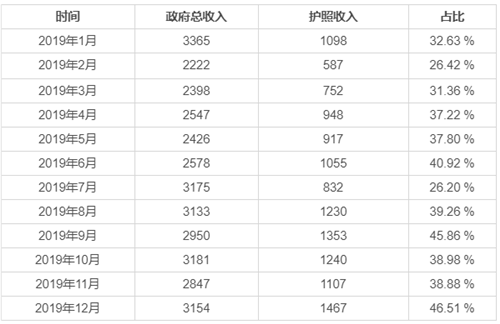 在整個年度中,CIP在總收入中所占的比例持續上升,并且在12月占政府總收入一半的比例。整個2019年,瓦努阿圖護照總收入,以及占政府所有收入的比例如下(單位VT 百萬、: