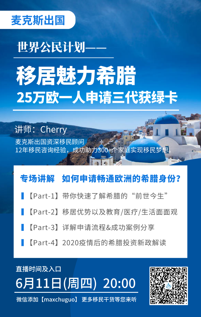 6月11日20:00,鎖定 麥克斯出國-【希臘移民】專題講座,聽移民專家為您全面解析疫情特殊時期下,希臘移民的狀況和前景。