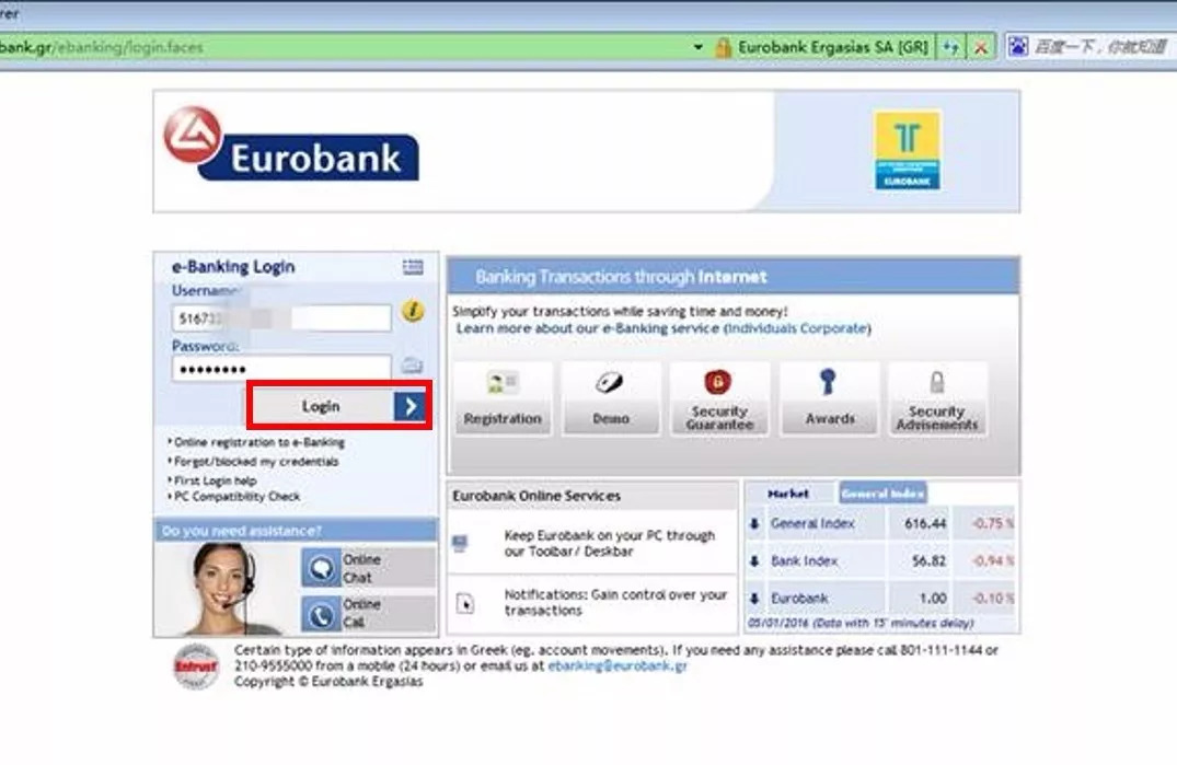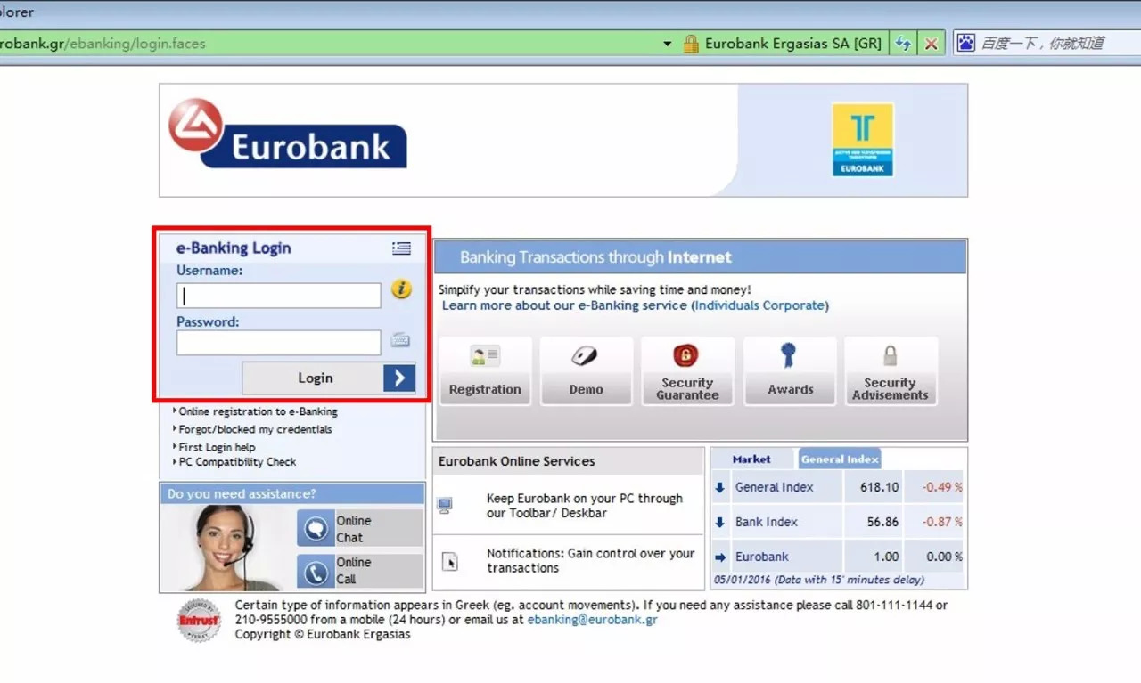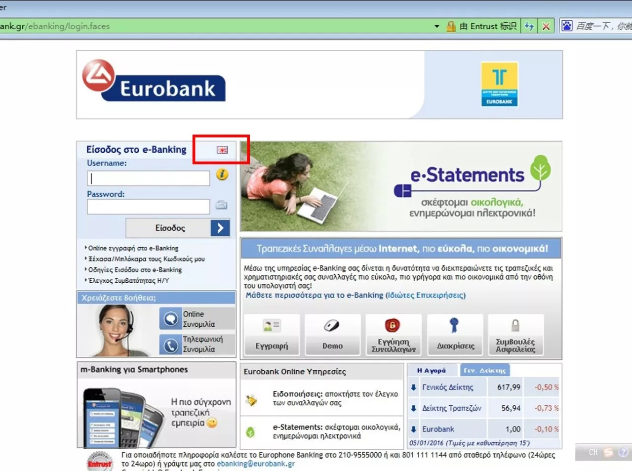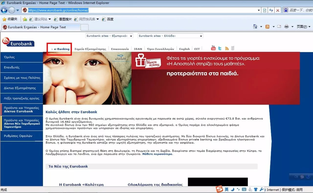 1. 使用 Windows 系統(tǒng)自帶的 IE 瀏覽器,登陸https://www.eurobank.gr,進(jìn)入以下頁面: