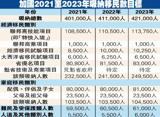 新聞報道中,加拿大的相關領導人門迪奇諾就表示過,移民是加拿大實現短期復蘇和長期繁榮的關鍵所在。因為加國長期存在的死亡率高、出生率低的情況,導致加國的勞動力市場嚴重不足,很多工作沒有人去做,耽誤了當地經濟的發展。 所以在21到23三年間,計劃吸納近1233000人永久居民。暫定計劃是2021年目標為401,000人,2022年目標為411,000人,2023年目標為421,000人。計劃焦點旨在經濟增長,確定家庭團聚的重要性,并履行加國保護全球難民的承諾。在這份移民計劃匯總,經濟移民占有5成,家庭團聚移民占據4成,其他部分占據為1成,具體情況如下表: