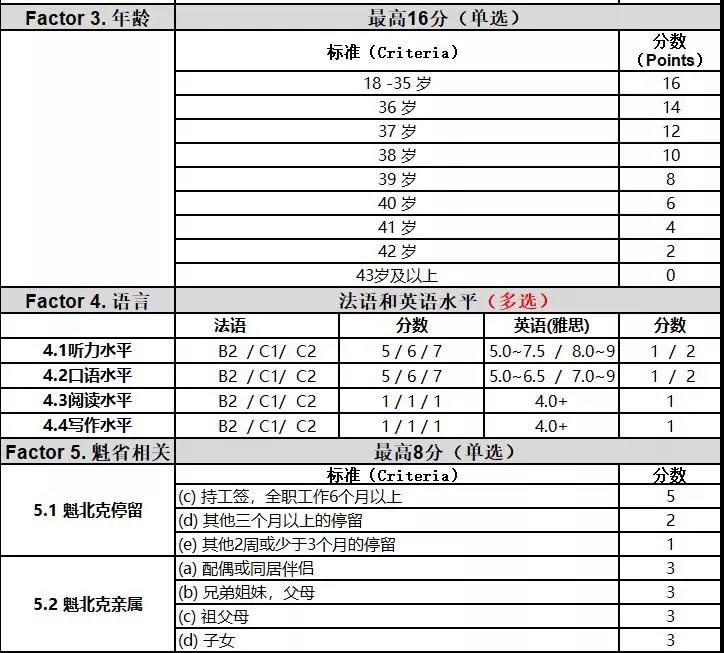 開聊前我們先做一個簡單的打分:按照移民政策,有無魁省留學經驗在打分上會有一些差別,保守起見,我們默認申請人沒有魁省本地大學的文憑,把整個打分表劃分為9個小部分: