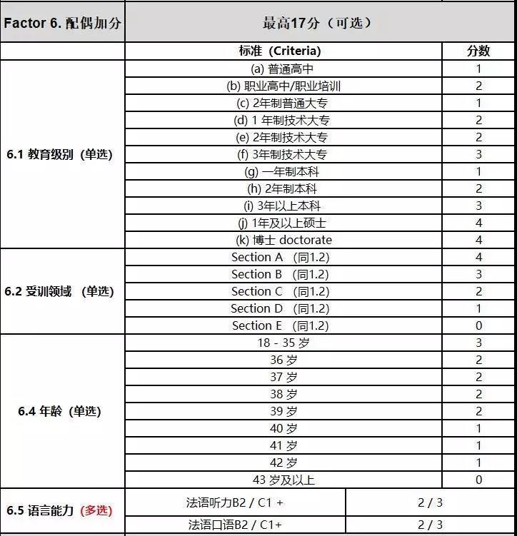 3.對于已婚人士,通過自己的配偶和孩子也是可以獲得加分的,配偶最高可以加到17分,如果兩個或兩個以上的12歲以下子女,按照打分表,是可以額外最多加到8分的,孩子多在加拿大這里,屬于大優勢。