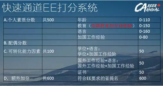 官網上列出了9類移民種類,其中與留學生相關的是快速通道聯邦移民打分系統以及省提名。首先介紹加拿大聯邦移民打分系統(為什么說聯邦呢,因為要和后面討論的各個省的省提名移民分開)的Express Entry(以下簡稱EE)。 EE從2015年1月開始實施,實施的目的是通過技能,工作經驗,語言能力,教育水平等綜合打分來篩選最適合加拿大需要的人。評分標準如下: