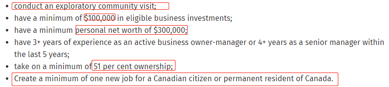 獲得指定社區的推薦(community referral)并進行商務實地考察 符合條件的商業投資不低于$10萬加幣; 最低個人凈資產$30萬加幣; 過去5年內,擁有3年以上企業主管理經驗,或者4年以上企業高管經驗; 至少擁有51%的當地企業股份; 為加拿大公民或者永久居民創造至少一個就業機會;