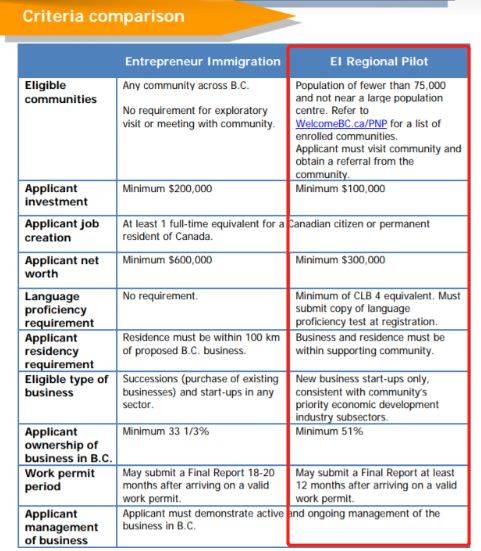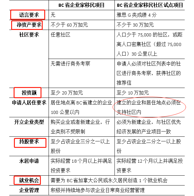 BC省企業家移民項目與此次企業家移民社區試點項目的比較
