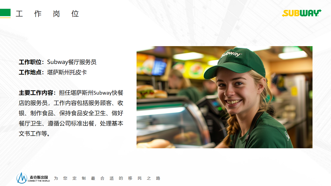 我們麥克斯出國(guó)合作的一批雇主,就是來(lái)自美國(guó)本土的——賽百味快餐店。